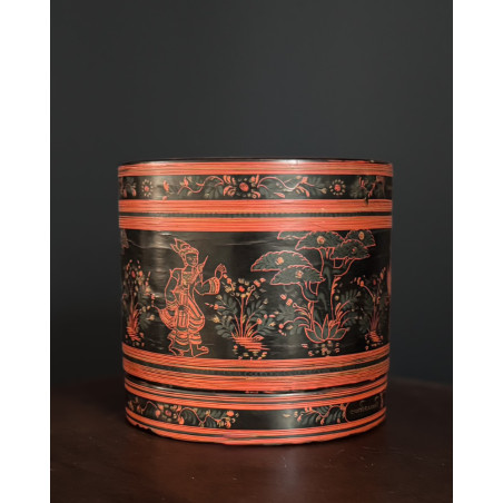 This antique Burmese lacquer betel box, shaped like a hat box, is covered with drawings on the top and sides of its main lid, as well as on each of its two trays and on the bottom and around the base. These boxes were (and still are, in a more modern form) the actual boxes used to store the ingredients needed to prepare betel quids, a mild stimulant that also freshens the breath. Beautifully decorated, traditional boxes were a fundamental part of hospitality when welcoming guests, who were systematically offered betel bites: they allowed the various ingredients to be presented in an impressive and solemn manner by spreading all the trays of this box on a low table so that guests could choose their favorite ingredients. This antique piece shows signs of long use but is in good condition overall. The sign of the age of these boxes is how easy they are to open and close, with the different trays sliding smoothly, unlike newer boxes whose lacquer is still sticky.