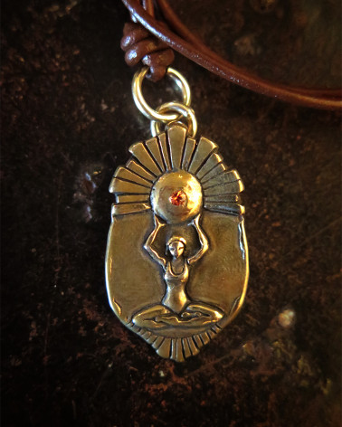 This bronze pendant has 1 orange sapphire. The adjustable leather cord allows you to adjust it ideally to your body type and your outfit, but it can also be worn with a colorful silk ribbon or a Catherine Michiels chain. Surya embodies the feminine power and its essence. She holds the universe by giving birth to the world, like a deity. She surrounds herself with her loved ones, living or dead, who permanently surround her.