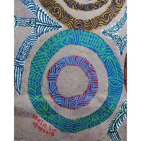 The “Recycled” series is a very personal project for Htein Lin. When he was in prison, he created many works on A4 paper in secret, which he managed to covertly get out and sent to his wife to get them to safety. Unfortunately, she was angry with him, and she gave all these pieces of paper to the waste collector. When Htein Lin finally left prison and learned what had happened to his work, he went to the waste collector. He could find no trace of his work, but he saw the recycled material - large sheets of thick, rough cardboard that he believed could contain some of his works. So, he bought many of these sheets of recycled cardboard, which he has since used as a canvas for his paintings, including those he created during his years spent in London. He never completely covers the cardboard with his paintings. The exposed surfaces allow a clear view of part of the substrate, with all its coarse imperfections. Most of these sheets are not really flat. They seem to have gentle ripples, and Htein Lin uses this feature accordingly to lay out his work. They stick out the frame, going against the traditional construction of a two-dimensional painting. He noticed that it was impossible to completely flatten the cardboard sheets, which went back to their original shape by themselves. Htein Lin sees this as a message of hope with regard to his own recycling. All different and distinctive, yet with certain recurring motifs, these works seem to map out Htein Lin's subconscious. He draws curved lines and wavy columns, shapes which flow directly from his imagination to his brush. They are often full of small drawings which derive from the traditional sculptures of Myanmar and were also the favourite motifs of Bagyi Aung Soe, one of the masters of modern art in Myanmar and a hero figure for Htein Lin. Circles and wheels appear frequently and reflect Htein Lin's Buddhist beliefs regarding the circle of life. Returning to life after nearly seven years in prison, Htein Lin said that he personally felt “recycled” - rather harshly, yet full of a new purpose. At the same time, he felt the need to continue painting the “Recycled” series for his artistic development. He realised that we are not recycled just once, but rather again and again, a process rather than an end.