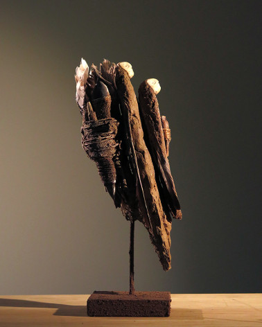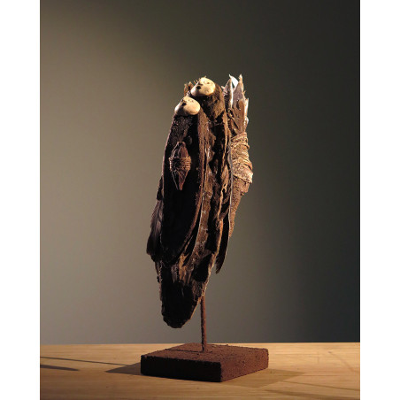 Jephan de Villiers, an avant-garde ecologist, takes us out of our daily life with his creations, towards «an imaginary civilization that seems to be of a past where man and nature were one». Each of his sculptures is a poignant testimony to the lost harmony between man and nature. They all come from gleaning fragments of nature, roots, twigs, wood, bark, shells of horseshoe crabs, feathers, bugs, soil and mud… Jephan de Villiers likes to say, “I don’t invent anything, I remember.”