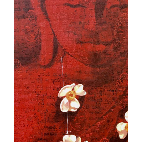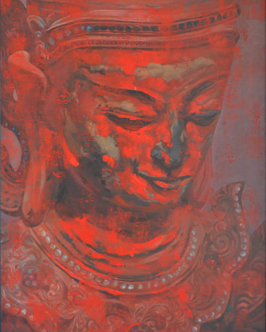 "Khin Zaw Latt studied english in a monastery from 2002 - 2004. It is therefor not surprising that the Buddha served as the inspiration for his first series of paintings. These paintings are made by first applying a background of color, at times extending the shade to almost black... at the end, KZL carved a number of wooden stamps of Buddha images of different sizes and forms, and used them to stamp the canvas.