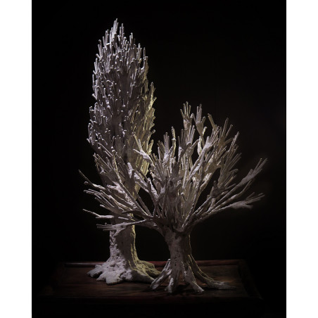 Ndary Lo is an internationally renowned artist, one of the most active African artists in the development of installations. Ndary Lo was sensitive to nature, to its progressive destruction through human action and inaction. Highly mobilized by the project launched by the African Union of the “green wall” intended to counteract the desertification of the Sahel, it produces in 2008 a masterful installation, forest of a hundred trees degranded in reinforcement bars, of which not one is the same to the other. He thus inaugurated a series of trees of different dimensions, with abundant forms and branches ending with hands as signs of friendship, if not calls for help, implorations or affirmation of combat. The sculptor Ndary Lo had for preferred materials all the materials of recovery - to give them a second life - and in particular, the reinforcement bars, alone or covered with various patinas, especially in the works of the last years. On the occasion of the exhibition “J'aime les arbres”, Retour De Voyage presents a series of small sculptures (40 to 60 cm), entitled “arbres des origines” which symbolizes the power of life. It is this message that Ndary Lo transmits to us through his human trees, which draw their strength from their semi-apparent roots and rise towards the sky with endings in the form of hands as to implore a greater respect for nature...