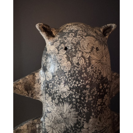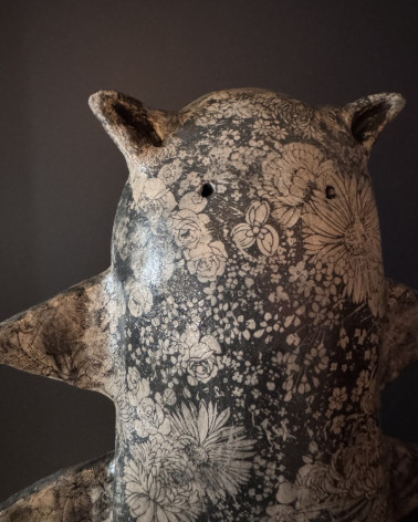 Inspired by Japan-inflected imagery, shamanism, and a form of personal mythology, these ceramic statues fully embrace a playful dimension: covered with flowers, signs and colours, the totems open wide, round eyes onto the world.