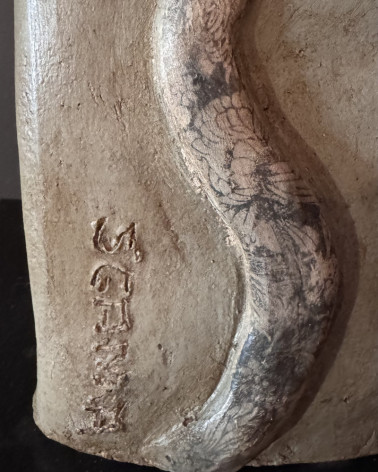 The sculpture is slender, floral to the point of saturation: motifs overlap until they form a continuous, almost textile surface. Flowers rise, layer upon layer, repeating themselves rhythmically.