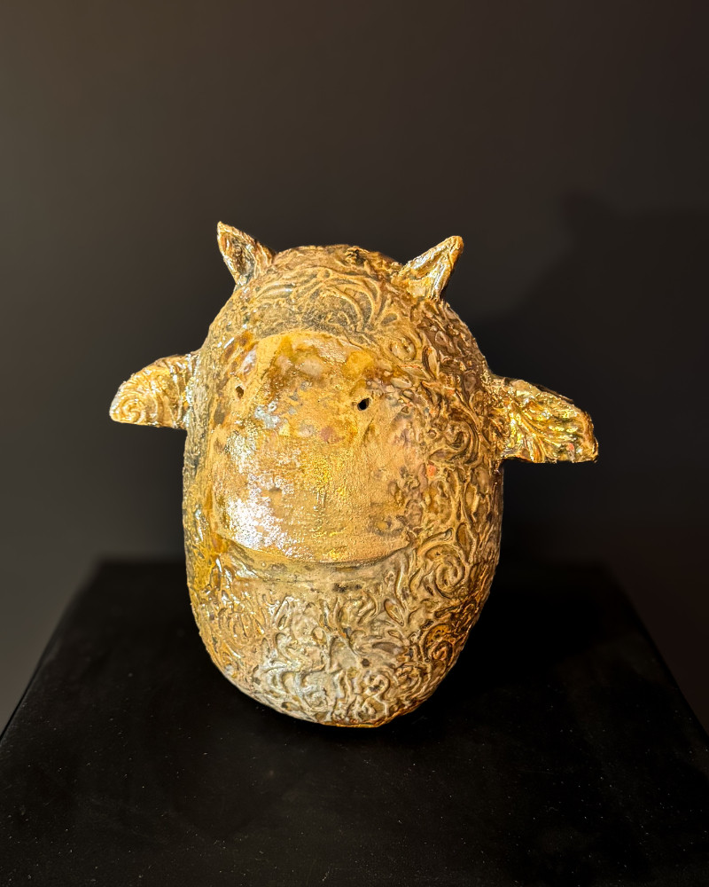 A totemic statue with a discreet gaze and no expressive mouth. Its eyes, barely open, seem to emerge from the material itself. The surface, marked with organic patterns and golden traces, evokes a slow memory—that of fire, soil, and time.