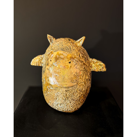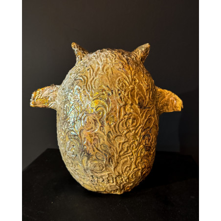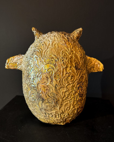 Discover Pierre Sgamma's series of seven ceramic totems, created for the exhibition “Japan 1968”: playful and joyful shamanism. The “Totem of patient earth” is covered with organic patterns and golden traces.