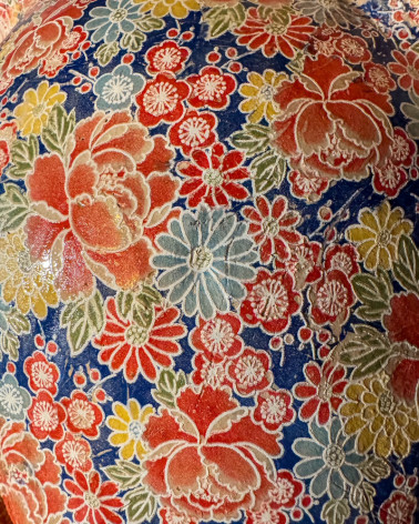 Hanagasa wears a festive garden around its head and across its colourful body. The crown forms an unbroken ring, like a dance held still. Its face, left almost bare, retains the trace of the fire.