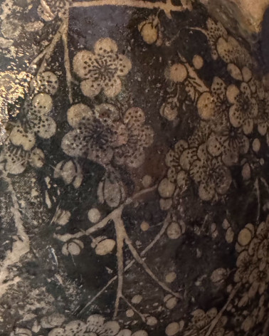 Beneath the patinated enamel and golden highlights, floral motifs emerge and fade away, like overlapping seasons. Nothing here is fixed: light reveals, and light erases.