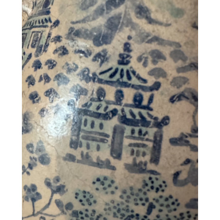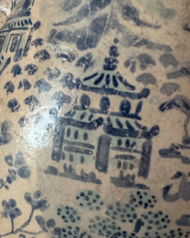 Its body becomes a finely drawn landscape: pagodas, flowers and motifs unfold freely, forming a miniature world patiently composed across the ceramic surface, with no beginning and no end.