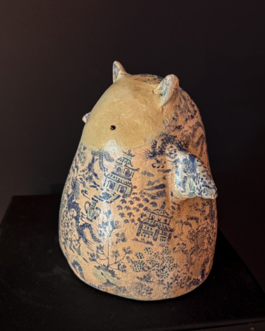The eye wanders, pauses, returns. Every detail highlights the quality of the drawing, the mastery of the hand and the evident pleasure in decoration. Seiryū is not only a sculpture, but a surface to explore — an object that reveals itself over time.Its deliberately tiny eyes do not dominate the scene; they belong to it. They give the figure a gentle, companionable presence, as if it were living inside its own inner garden.