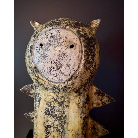 Discover Pierre Sgamma's series of seven ceramic totems, created for the exhibition “Japan 1968”: playful and joyful shamanism. The “Totem of the Nocturnal Watch” is an original, enduring and deeply inhabited work, capable of forming an intimate and evolving relationship with its owner.
