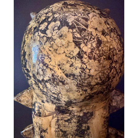 The contrast between its pale face, gently marked by time, and its richly decorated body highlights the finesse of the surface work. Floral motifs, drawn with remarkable precision, form a continuous mantle somewhere between textile and bark, inviting prolonged observation. Each encounter reveals new details, deepening the viewer’s attachment to the piece.