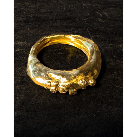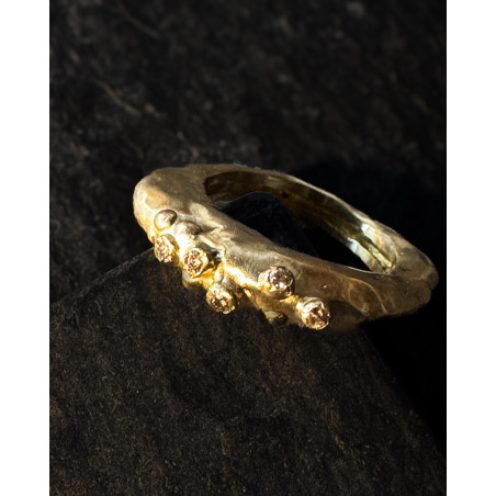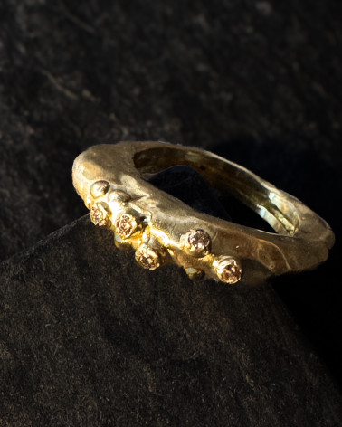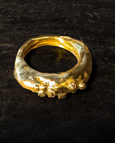 Rosa Maria has the gift and talent to create unique rings. The irregularity of their surface gives them character and makes them true works of art. They reflect the light and are in perpetual movement: impossible to get tired of them. We are amazed and surprised each time we look at them, because they reveal a new facet each time. The raw and almost "rustic" material is perfectly balanced with the presence of precious stones that bring softness and finesse. It is the combination of these materials that gives panache and personality to each of these rings. Rosa Maria creates and produces a line of jewellery that has been touring the world for years.