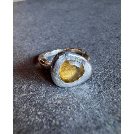 A 1.68 ct honey-colored quartz mounted on a hammered and embossed sterling silver (925) ring. This ring has a raw sparkle!