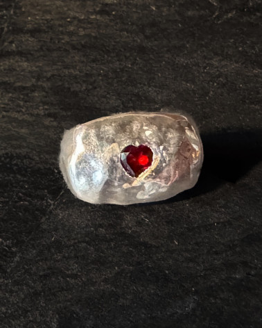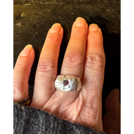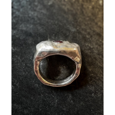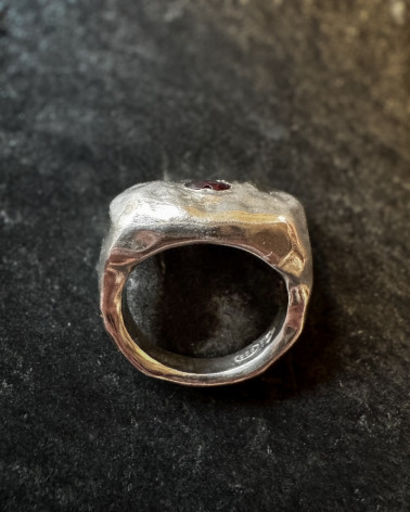 This ring, selected by Retour De Voyage among the creations of Rosa Maria, presents in a rectangular shape a shiny heart of garnet shining bright.