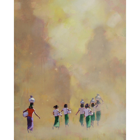 The series "Silent Sweat" reflects the tension and difficulty of the women and children in charge of the water supply. The characters in his paintings are tiny, showing that they feel small and powerless in the face of a fundamental problem for their survival. The decoration of all these paintings consists of the magnificent temples of Mrauk Oo. Than Kyaw Htay blurred their contours to make tangible his sadness at seeing the heritage and history of the Rakhine evaporate, due to the misdeeds of time and the lack of maintenance.