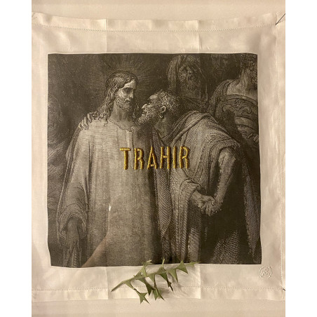 This mythical scene, signs the shift from one world to another. With this kiss, Christ is designated, arrested and crucified. A kiss can change a life. Be the founding act of a union. And this is what is addressed in this reinterpretation of Gustave Doré’s painting. It is the importance of a gesture of desire, and desire is our master.