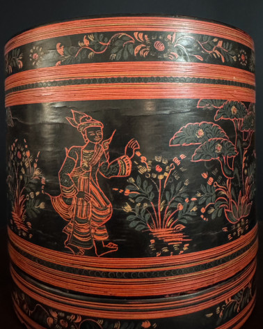 Cette ancienne boîte à bétel en laque birmane, en forme de boîte à chapeaux, est recouverte de dessins, sur le dessus et les côtés de son couvercle principal, mais aussi sur chacun de ses deux plateaux et sur le fond et le pourtour de la base. Ces boîtes étaient (et sont toujours, sous une forme plus moderne) les vraies boîtes utilisées pour la conservation des ingrédients nécessaires à la préparation des chiques de bétel, un stimulant doux qui rafraîchit également l'haleine. Joliment décorées, les boîtes traditionnelles étaient un élément fondamental de l'hospitalité lors de l'accueil des invités à qui on offrait systématiquement les bouchées de bétel : elles permettaient présenter de façon impressionnante et solennelle les différents ingrédients en étalant l'ensemble des plateaux de cette boîte sur une table basse, afin que les invités puissent choisir leurs ingrédients préférés. Cette pièce ancienne montre des preuves d’une longue utilisation mais elle est dans l'ensemble en bon état. Le signe de l'âge de ces boîtes est leur facilité d'ouverture et de fermeture, les différents plateaux glissant avec une parfaite fluidité, contrairement aux boîtes plus récentes dont la laque est toujours collante.