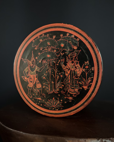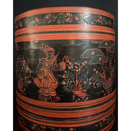 Objet typique de la Birmanie, la boîte à bétel est faite de bambous recouvert de couches de laque (jusqu'à 15). Elle est finement peinte sur toutes ses faces par un artiste talentueux. Sur cette boîte, nous avons un motif représentant des hauts personnages profitant des bienfaits de leur jardin, cueillant des fruits dans un parterre de fleurs.