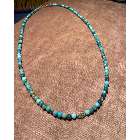 Ce collier court (40 cm) est une véritable beauté. Une ligne de turquoises parsemée de cubes en or rehausse la beauté du petit pavé de diamants. C'est là toute l'étendue de la créativité de Catherine, qui allie l'émerveillement artistique à une dimension spirituelle pour que chacun de ses bijoux contribue à notre bien-être.