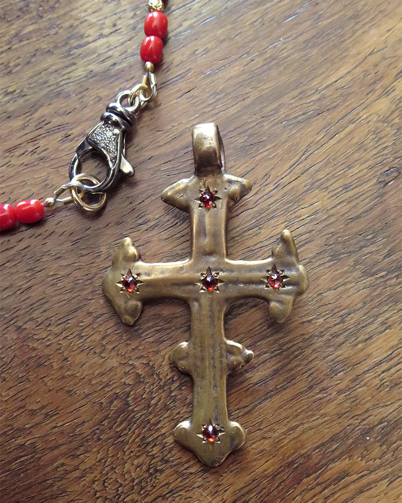 Croix en bronze, sertie de Grenats, accrochée à un collier en Corail et cubes or, doté d'un petit mousqueton en argent massif serti de diamants sur chacune de ses deux faces, qui permet d'accrocher un charm ou un pendentif et de fermer le collier.