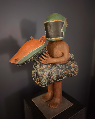 La terre cuite, brute et chaleureuse, se marie à des pigments et des oxydes sombres et mats. Le modelé, à la fois naïf et expressif, confère à la figure une humanité désarmante : on y lit autant d’humour que de gravité. Le casque, rappelant celui d’un pilote moderne, cache le visage et fait de cet homme un archétype universel, un témoin du courage et de la vulnérabilité mêlés.
