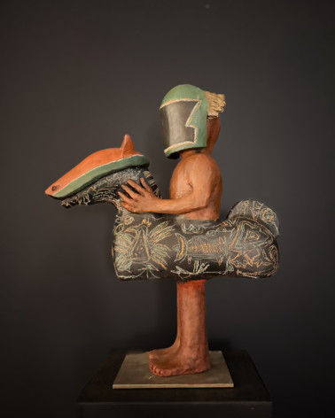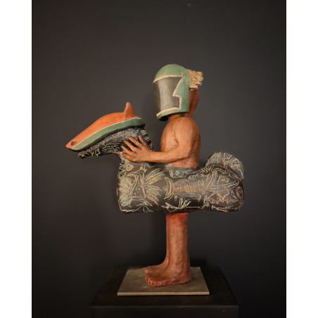 Cette sculpture en céramique, œuvre signée de Pierre Sgamma, renverse avec poésie et ironie la figure du cavalier. L’homme, debout, solidement campé sur ses deux jambes et nu sous son casque, porte autour de sa taille sa monture — un animal imaginaire, mi-cheval mi-jouet, enluminé d’un motif foisonnant.