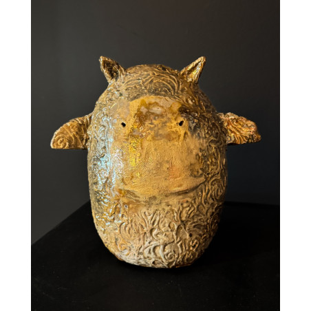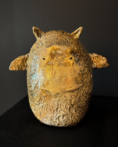 Une statue totémique au regard discrète et sans bouche expressive. Ses yeux, à peine ouverts, semblent surgir de la matière elle-même. La surface, marquée de motifs organiques et de traces dorées, évoque une mémoire lente - celle du feu, du sol et du temps.
