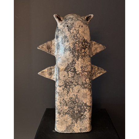 Conçue comme un ensemble cohérent, cette série marque la volonté de clore l’année sur une note joyeuse, libre et légèrement décalée, sans renoncer à la profondeur du geste sculptural. Inspirées par un imaginaire japonisant, par le chamanisme et par une forme de mythologie personnelle, ces statues en céramique assument pleinement une dimension ludique : les totems, couverts de fleurs, de signes et de couleurs, ouvrent de grands yeux ronds sur le monde.