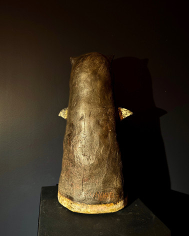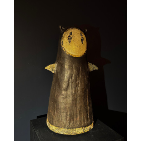 Son visage doré, proche d’un masque rituel ancien, est traversé de signes plutôt que de traits, donnant à l’œuvre une dimension symbolique rare. Le corps, dense et vertical, absorbe la lumière avec subtilité, révélant selon l’éclairage une richesse de textures et de nuances. Cette relation directe à la matière témoigne d’une maîtrise affirmée du geste céramique.