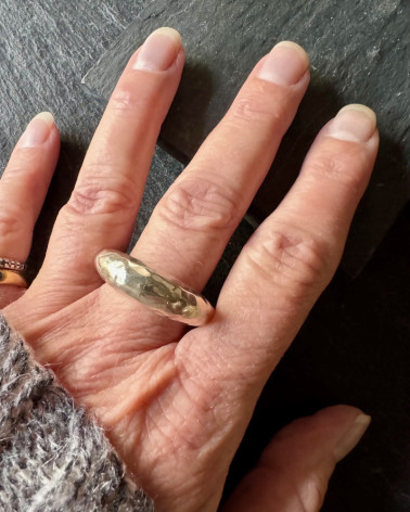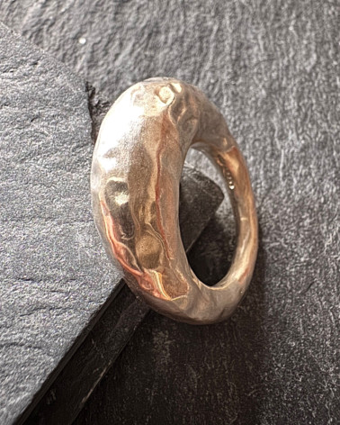 Rosa Maria a le don et le talent de créer des bagues uniques. L'irrégularité de leur surface leur confère du caractère et en font de vraies œuvres d'art. Elles reflètent la lumière et sont en perpétuel mouvement : impossible de s'en lasser. On est émerveillé.es et surpris.es à chaque fois que notre regard se pose sur elles, car elles révèlent à chaque fois une nouvelle facette. La matière brute et presque "rustique" est parfaitement équilibrée avec la présence des pierres précieuses qui apportent douceur et finesse. C'est la rencontre de ces matières qui donne le panache et de la personnalité à chacune de ces bagues. Rosa Maria crée et produit une ligne de bijoux qui fait le tour du monde depuis des années.
