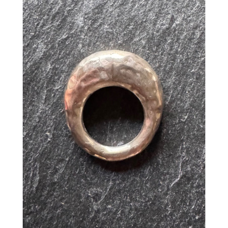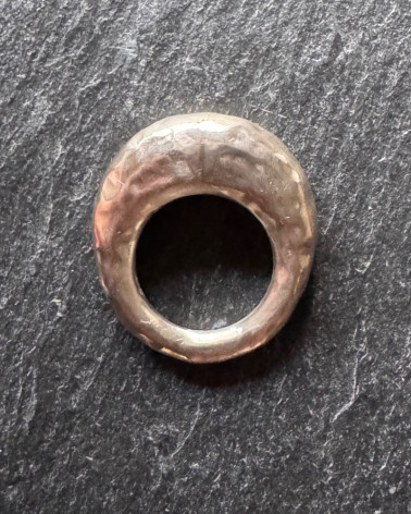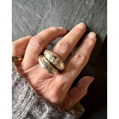 Gros anneaux martelés, légèrement ovales en argent tout simple, ou en argent serti de 3 diamants cognac (0,5 cts) et d'un rubis (0,03 cts), les deux peuvent se compléter, ou pas, se marier avec les bagues Rowanda ou avec les larges anneaux plats, ou toutes autres bagues à votre goût.