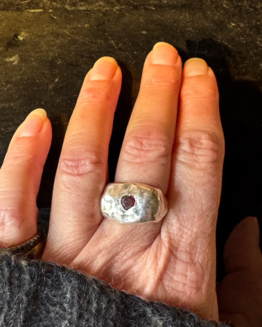 Cette bague, sélectionnée par Retour De Voyage parmi les créations de Rosa Maria, présente sous une forme rectangulaire un cœur de grenat brillant de mille feux.