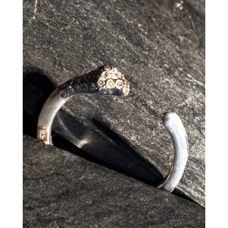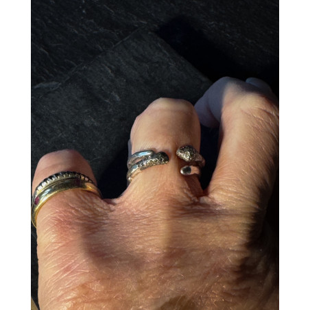 Les bagues Snackes ont été créées au Liban par Rosa Maria. La forme sophistiquée de ces anneaux ouverts se termine par un bouquet de diamants cognac, formant une petite tête de serpent.
