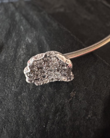 Sertis dans le métal, 30 diamants rose cut captent la lumière avec subtilité, et contrastent délicatement avec l’argent. A l’autre extrémité, divinement enchâssé dans le métal, un diamant noir ajoute un éclat discret, presque secret, comme une constellation piégée dans la matière. L’ensemble compose une pièce à la fois organique et précieuse, au design intemporel.